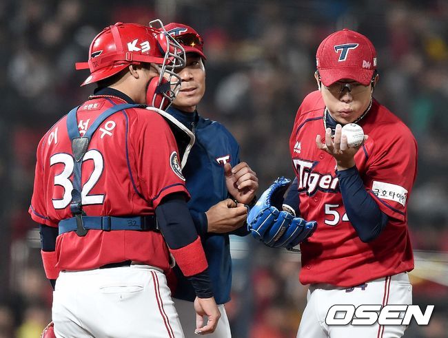 6회말 kt 공격 2사 1, 2루 상황 KIA 선발 양현종과 포수 이성우가 마운드에 오른 이대진 코치와 대화를 나누고 있다.