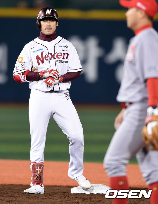 3일 오후 서울 목동구장에서 열린 '2015 타이어뱅크 KBO리그' 넥센 히어로즈와 SK 와이번스의 경기,5회말 넥센 문우람이 1타점 2루타를 날린 뒤 타임을 요청하고 있다.