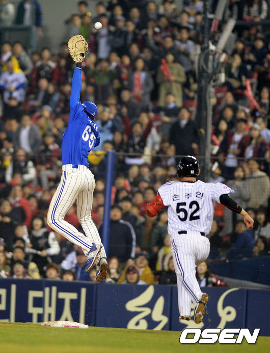 3일 오후 서울 잠실야구장에서 열린 '2015 타이어뱅크 KBO 리그' LG 트윈스와 삼성 라이온즈의 경기, 7회말 무사 2루에서 삼성 박석민이 LG 손주인의 3루땅볼에 1루로 악송구, 구자욱이 놓치고 있다.