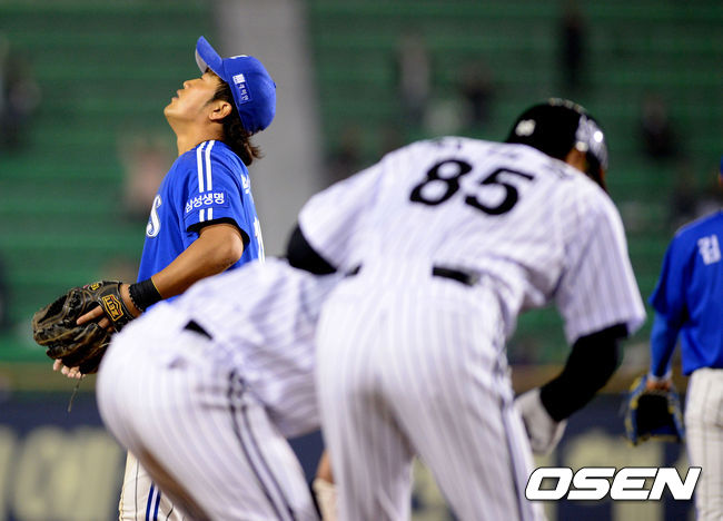3일 오후 서울 잠실야구장에서 열린 '2015 타이어뱅크 KBO 리그' LG 트윈스와 삼성 라이온즈의 경기, 7회말 무사 2루에서 삼성 박석민이 LG 손주인의 3루땅볼에 1루로 악송구, 무사 2,3루의 위기를 맞으며 아쉬워하고 있다.