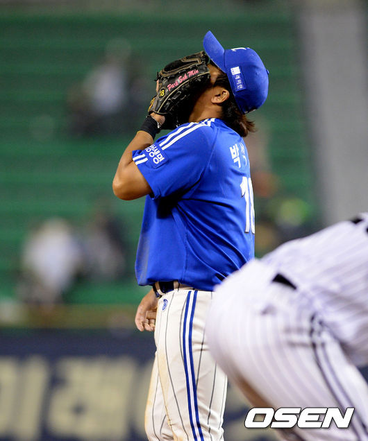 3일 오후 서울 잠실야구장에서 열린 '2015 타이어뱅크 KBO 리그' LG 트윈스와 삼성 라이온즈의 경기, 7회말 무사 2루에서 삼성 박석민이 LG 손주인의 3루땅볼에 1루로 악송구, 무사 2,3루의 위기를 맞으며 아쉬워하고 있다.