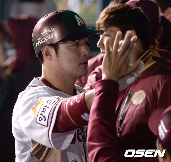 3일 오후 서울 목동구장에서 열린 '2015 타이어뱅크 KBO리그' 넥센 히어로즈와 SK 와이번스의 경기, 6회말 넥센 박병호가 연속타자 홈런을 날린뒤 동료들의 축하를 받고 있다.