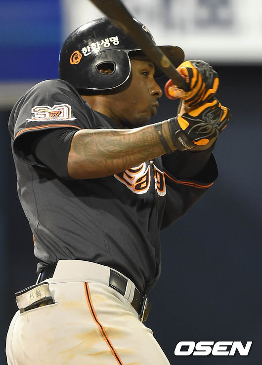 3일 오후 창원 마산구장에서 열리 '2015 타이어뱅크 KBO 리그' NC다이노스와 한화 이글스의 경기, 5회초 무사 주자 만루 한화 모건이 3루주자 강경학을 불러들이는 땅볼을 치고 있다.