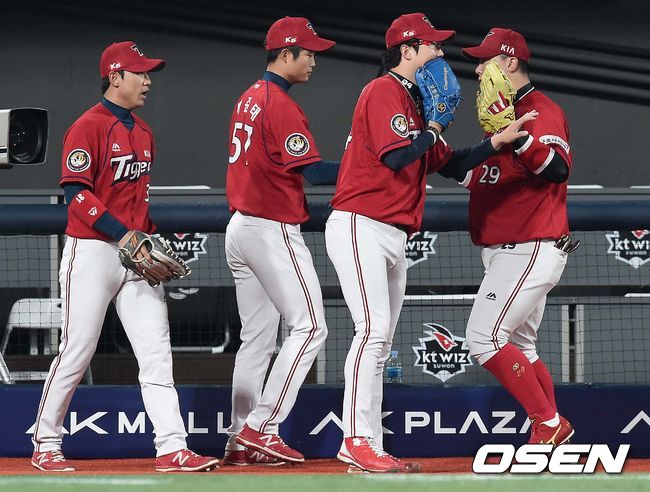 7회말 kt 공격 2사 2루 상황 대타 윤도경을 삼진으로 처리하며 무실점으로 이닝을 마친 KIA 선발 양현종이 더그아웃으로 향하며 야수들과 인사를 나누고 있다.