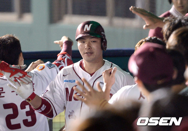 3일 오후 서울 목동구장에서 열린 '2015 타이어뱅크 KBO리그' 넥센 히어로즈와 SK 와이번스의 경기, 6회말 넥센 박병호가 연속타자 홈런을 날린뒤 동료들의 축하를 받고 있다.