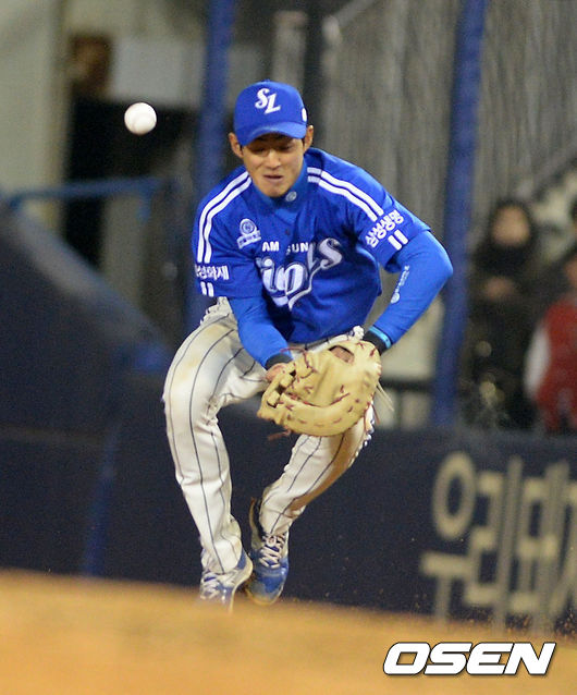 3일 오후 서울 잠실야구장에서 열린 '2015 타이어뱅크 KBO 리그' LG 트윈스와 삼성 라이온즈의 경기, 8회말 무사에서 삼성 구자욱이 LG 이병규의 1루 땅볼 타구를 놓치고 있다.