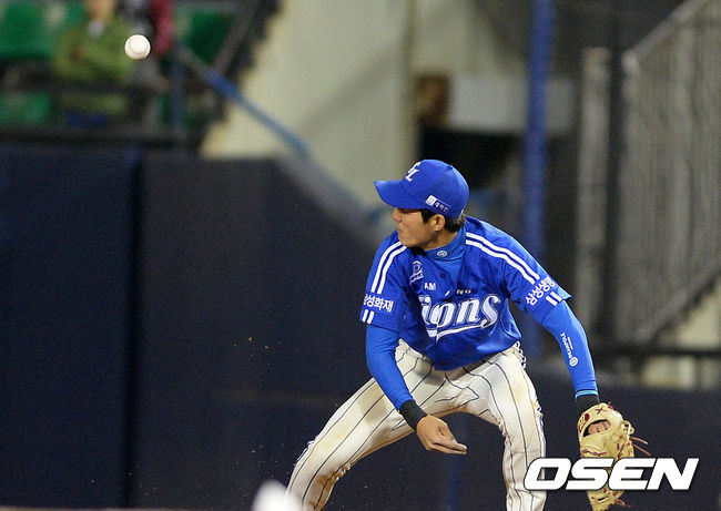 3일 오후 서울 잠실야구장에서 열린 '2015 타이어뱅크 KBO 리그' LG 트윈스와 삼성 라이온즈의 경기, 8회말 무사에서 삼성 구자욱이 LG 이병규의 1루 땅볼 타구를 놓치고 있다.
