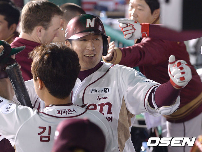 3일 오후 서울 목동구장에서 열린 '2015 타이어뱅크 KBO리그' 넥센 히어로즈와 SK 와이번스의 경기, 6회말 넥센 유한준이 2점 홈런을 날린뒤 동료들의 축하를 받고 있다.
