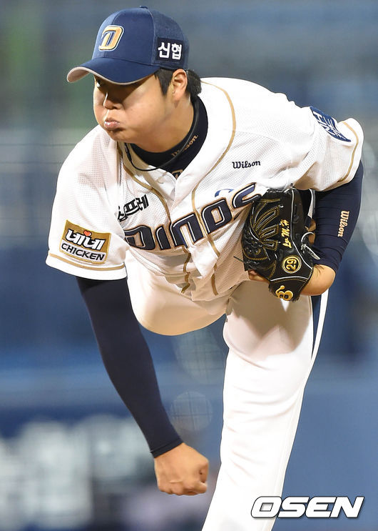 3일 오후 창원 마산구장에서 열리 '2015 타이어뱅크 KBO 리그' NC다이노스와 한화 이글스의 경기, 5회초 2사 주자 1루 NC 찰리의 뒤를 이어 마운드에 오른 이민호가 힘차게 공을 던지고 있다.