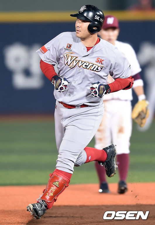 3일 오후 서울 목동구장에서 열린 '2015 타이어뱅크 KBO리그' 넥센 히어로즈와 SK 와이번스의 경기, 7회초 1사 1루 SK 이재원이 2점 홈런을 날린뒤 베이스를 돌고 있다.