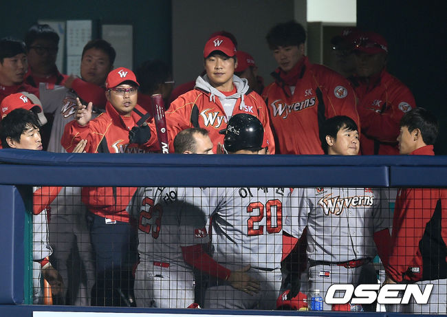 3일 오후 서울 목동구장에서 열린 '2015 타이어뱅크 KBO리그' 넥센 히어로즈와 SK 와이번스의 경기, 7회초 1사 1루 SK 이재원이 2점 홈런을 날린뒤 동료들의 축하를 받고 있다.