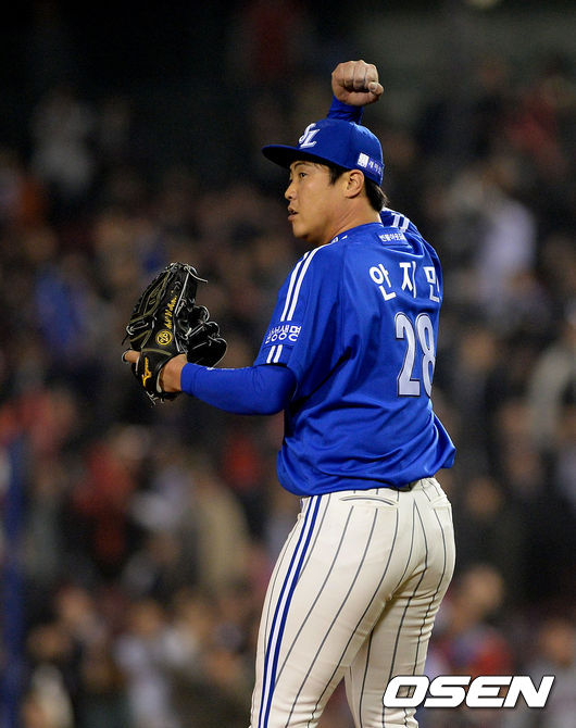 3일 오후 서울 잠실야구장에서 열린 '2015 타이어뱅크 KBO 리그' LG 트윈스와 삼성 라이온즈의 경기, 8회말 1사 만루에서 삼성 안지만이 LG 이병규를 병살로 처리하며 기뻐하고 있다.