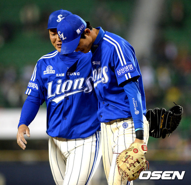 3일 오후 서울 잠실야구장에서 열린 '2015 타이어뱅크 KBO 리그' LG 트윈스와 삼성 라이온즈의 경기, 8회말 1사 만루에서 삼성 안지만, 구자욱이 LG 이병규를 병살로 처리하며 기뻐하고 있다. 구자욱은 무사에서 1루땅볼 타구를 놓치며 위기를 자초했다.