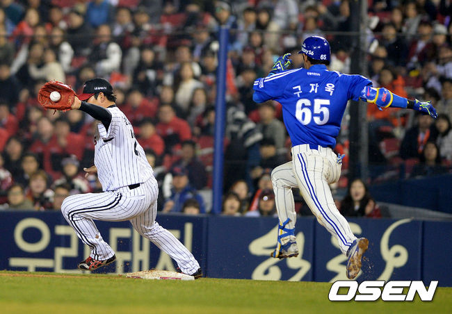 3일 오후 서울 잠실야구장에서 열린 '2015 타이어뱅크 KBO 리그' LG 트윈스와 삼성 라이온즈의 경기, 연장 10회초 삼성 구자욱이 1루 땅볼을 날리고 LG 정찬헌에 앞서 세이프되고 있다.
