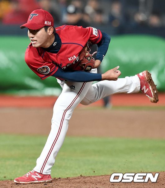 9회말 kt 공격 때 KIA 투수 홍건희가 힘차게 공을 뿌리고 있다.