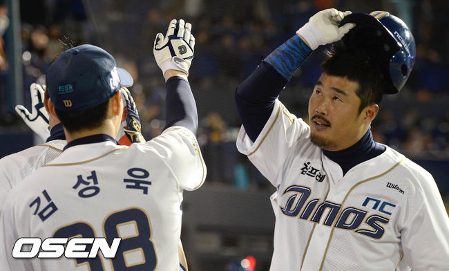 3일 오후 창원 마산구장에서 열리 '2015 타이어뱅크 KBO 리그' NC다이노스와 한화 이글스의 경기, 7회말 2사 주자1루 NC 이호준이 2점 홈런을 치고 더그아웃에서 기쁨을 나누고 있다.
