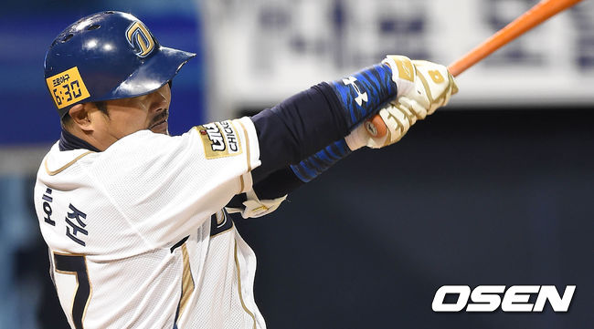 3일 오후 창원 마산구장에서 열리 '2015 타이어뱅크 KBO 리그' NC다이노스와 한화 이글스의 경기, 8회말 2사 주자만루 NC 이호준이 2타점 적시타를 치고 있다.