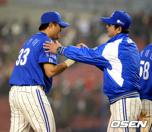 경기후 삼성 류중일 감독이 박한이와 승리 하이파이브를 하고 있다. /jpnews@osen.co.kr