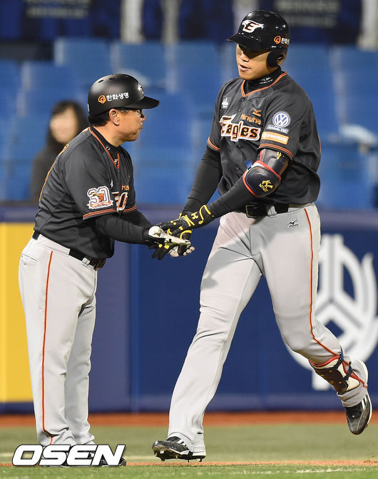 3일 오후 창원 마산구장에서 열리 '2015 타이어뱅크 KBO 리그' NC다이노스와 한화 이글스의 경기, 9회초 2사 주자 2,3루 한화 대타 최진행이 3점홈런을치고 3루코치와 기쁨을 나누고 있다.