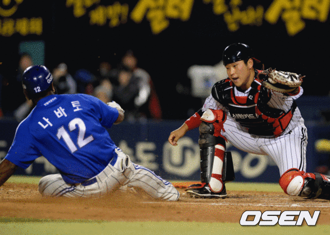 연장 10회초 2사 만루에서 박한이의 적시타 때 LG 실책까지 겹치며 1루주자 나바로가 홈에서 세이프되고 있다. 이 과정에서 나바로가 엉덩이에 태그를 당하며 괴로워하고 있다. /jpnews@osen.co.kr