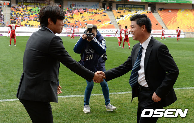 경기에 앞서 수원 서정원 감독과 부산 윤성효 감독이 악수를 나누고 있다.