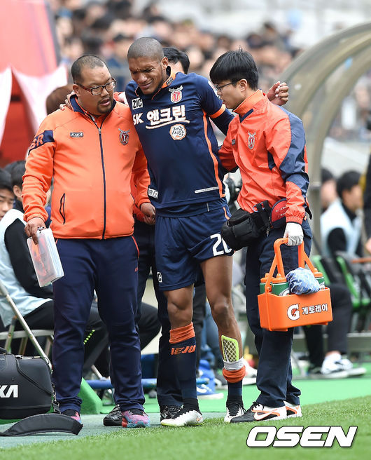 전반 제주 까랑가가 부상으로 교체되 벤치로 들어서고 있다.
