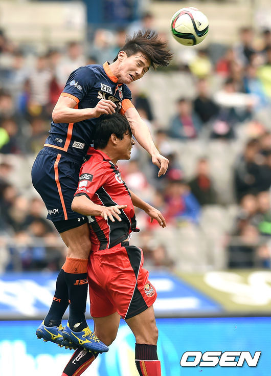 제주 오현석과 FC서울 박주영이 헤딩 경합을 벌이고 있다.
