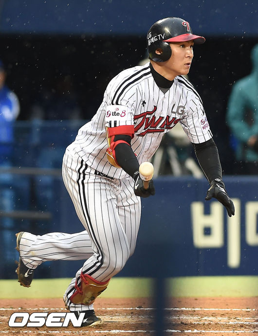 3회말, 2사 3루에서 LG 오지환이 1타점 적시타를 때리고 타구를 바라보고 있다.