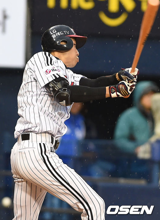4회말 2사 주자없는상황에서 LG 김용의가 좌익수 앞으로 떨어지는 안타를 치고 있다.