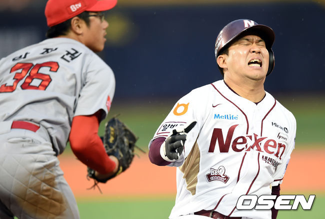4일 오후 서울 목동구장에서 열린 '2015 타이어뱅크 KBO리그' 넥센 히어로즈와 SK 와이번스의 경기, 4회말 1사 1루 넥센 김민성이 스나이더의 직선타때 1루로 귀루하다 아웃당하고 있다.