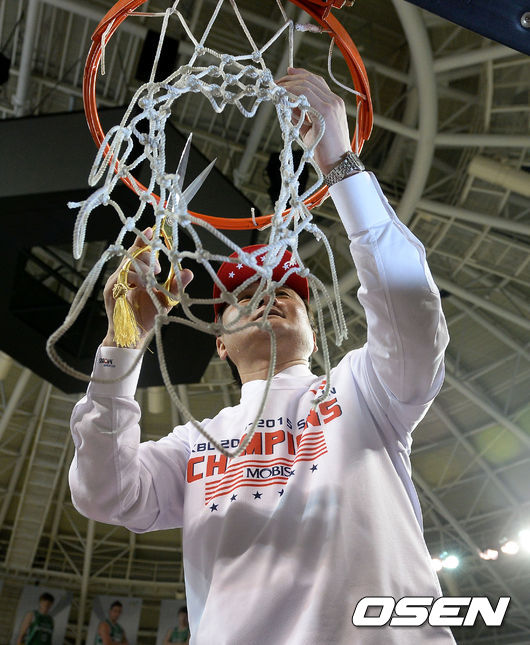 모비스 유재학 감독이 림 그물을 자르며 세리머니를 하고 있다./jpnews@osen.co.kr