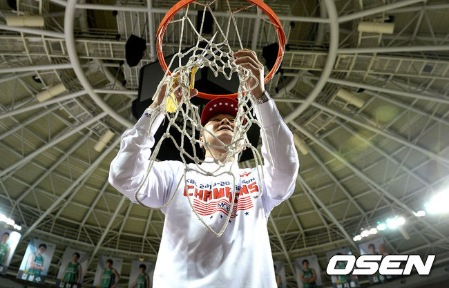 모비스 유재학 감독이 림 그물을 자르며 세리머니를 하고 있다./jpnews@osen.co.kr