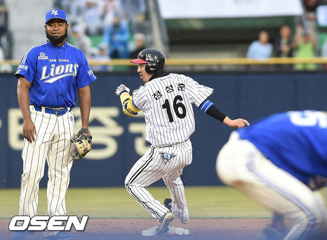 3말 2사 3루때 좌익수 앞으로 떨어지는 적시타 때린 LG 정성훈이 1루수 실책으로 2루까지 진루 하고 있다.