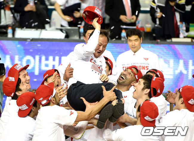 모비스 유재학 감독이 헹가래를 받으며 우승을 기뻐하고 있다./jpnews@osen.co.kr