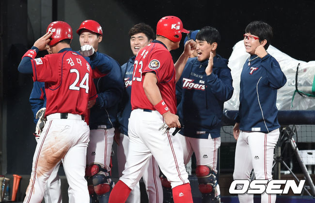 6회초 1사 1,3루에서 KIA 이성우의 우전 적시 2루타떄 홈을 밟은 KIA 최희섭과 김다원이 더그아웃에서 동료들과 하이파이브를 하고 있다.