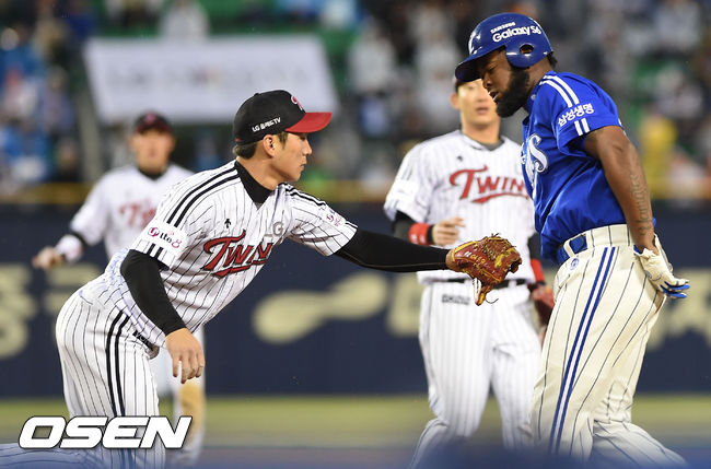 6회초 무사 1루 삼성 박한이 타석때, 2루 도루를 시도하던 1루주자 나바로가 런다운에 걸려 LG 유격수 오지환에게 태그아웃 되고 있다.