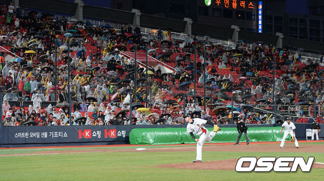 6회말 비가 내리는 가운데 경기가 진행되고 있다.
