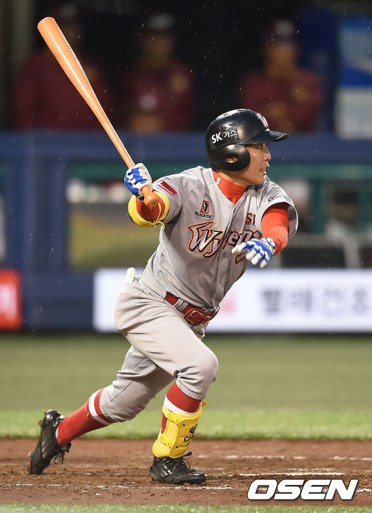 4일 오후 서울 목동구장에서 열린 '2015 타이어뱅크 KBO리그' 넥센 히어로즈와 SK 와이번스의 경기, 5회초 2사 만루 SK 조동화가 2타점 적시타를 때리고 있다.