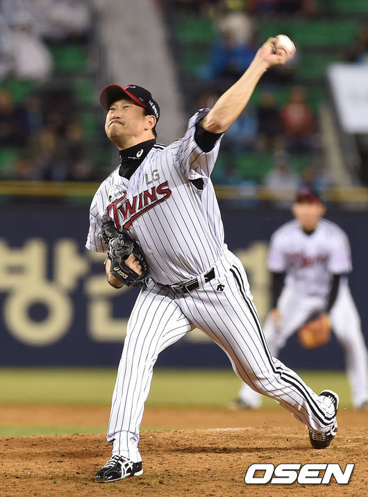 9회초 투수 이동현에서 교체된 LG 봉중근이 힘차게 공을 뿌리고 있다.