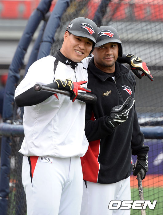 5일 오후 경기 수원 케이티위즈파크에서 진행된 '2015 타이어뱅크 KBO 리그 kt 위즈와 KIA 타이거즈의 경기에 앞서 kt 김상현과 마르테가 취재진을 향해 브이를 그리고 있다.