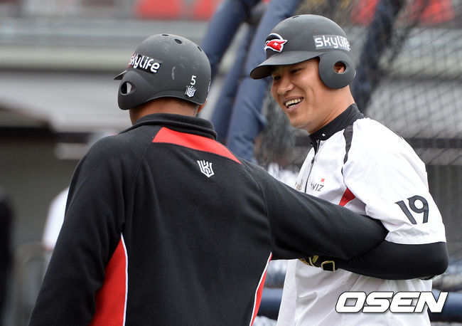 5일 오후 경기 수원 케이티위즈파크에서 진행된 '2015 타이어뱅크 KBO 리그 kt 위즈와 KIA 타이거즈의 경기에 앞서 kt 김상현과 마르테가 이야기를 나누고 있다.