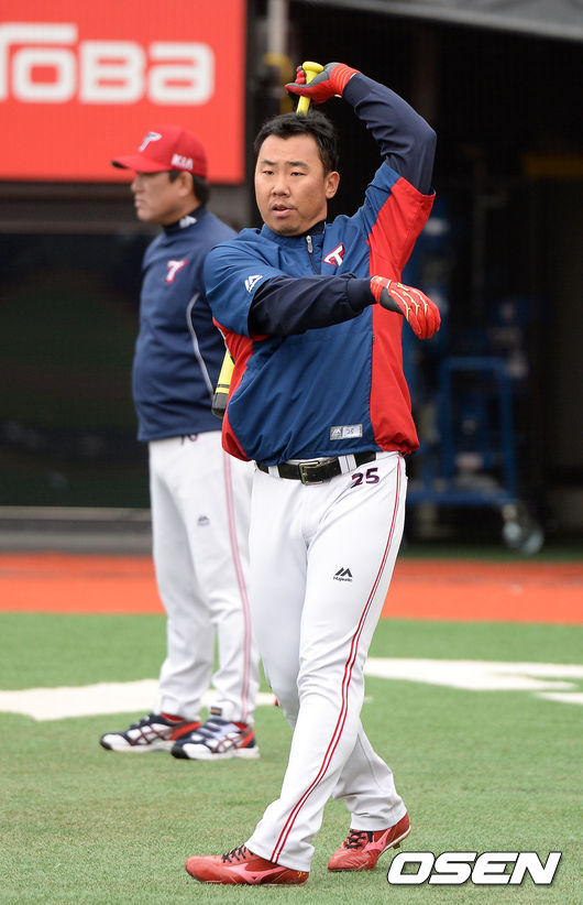 5일 오후 경기 수원 케이티위즈파크에서 진행된 '2015 타이어뱅크 KBO 리그 kt 위즈와 KIA 타이거즈의 경기에 앞서 KIA 이범호가 타격 훈련을 하고 있다.