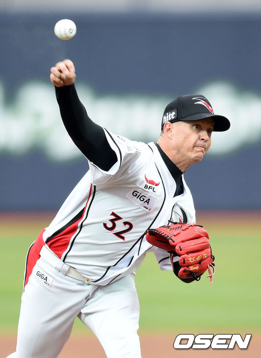 1회초 무사에서 kt 선발투수 옥스프링이 힘차게 공을 던지고 있다.