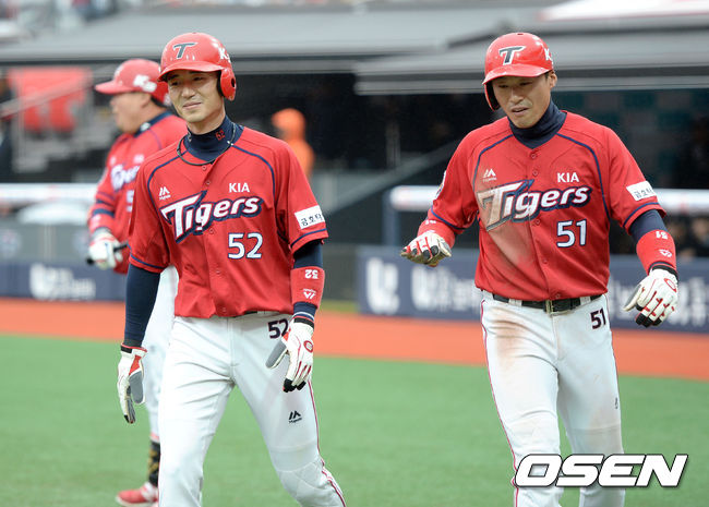 1회초 2사 만루에서 KIA 김다원의 좌전 2타점 적시 2루타때 홈을 밟은 김원섭과 최용규가 미소를 짓고 있다.