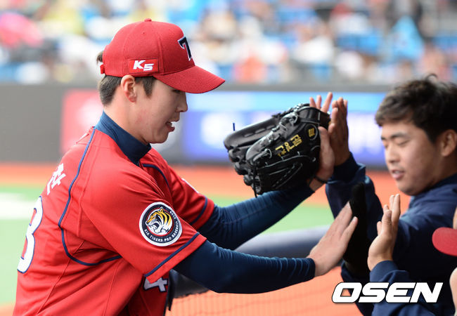 3회말 2사에서 kt 이대형을 내야땅볼로 처리한 KIA 문경찬이 더그아웃에서 동료들과 하이파이브를 하고 있다.