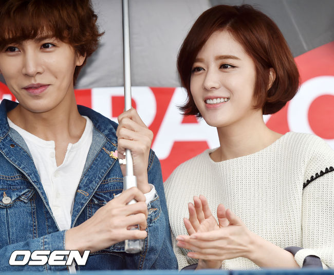 5일 오후 서울 잠실야구장에서 '2015 타이어뱅크 KBO 리그' LG 트윈스와 삼성 라이온즈의 경기가 열리기 전 관중석에서 mbc드라마넷 드라마 '나의유감스러운 남자친구'의 노민우와 양진성이 포즈를 취하고 있다.