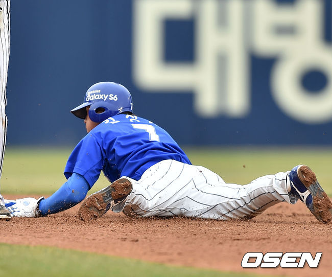 5일 오후 서울 잠실야구장에서 열린 '2015 타이어뱅크 KBO 리그' LG 트윈스와 삼성 라이온즈의 경기, 4회초 2사 주자 1루 삼성 나바로 타석에서 1루 주자 김상수가 2루 도루에 성공하고 있다.