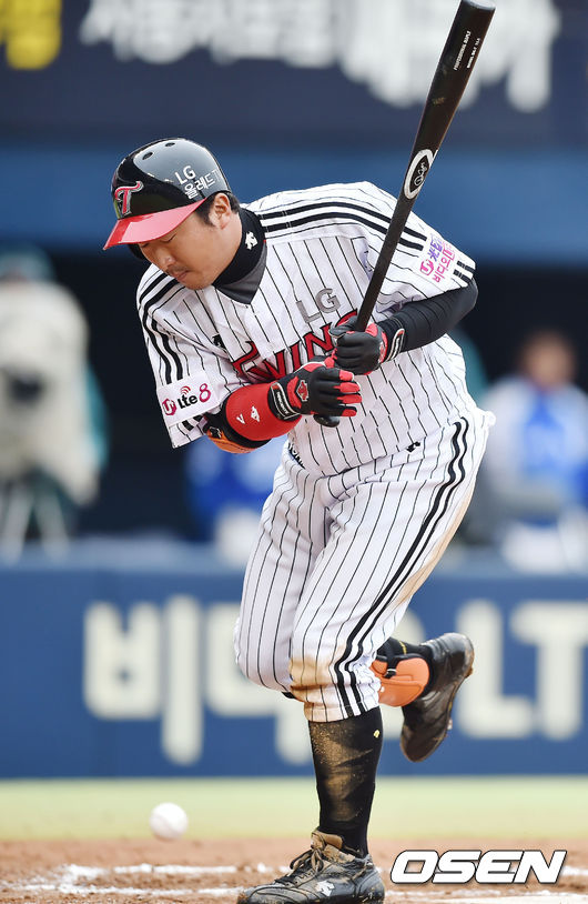 5일 오후 서울 잠실야구장에서 열린 '2015 타이어뱅크 KBO 리그' LG 트윈스와 삼성 라이온즈의 경기, 6회말 1사 주자 3루 LG 이병규가 어깨 쪽에 볼을 맞고 고통스러워하고 있다.