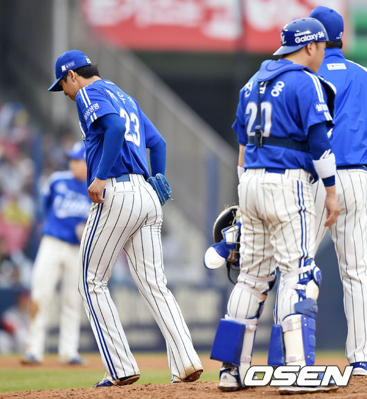 5일 오후 서울 잠실야구장에서 열린 '2015 타이어뱅크 KBO 리그' LG 트윈스와 삼성 라이온즈의 경기, 7회말 2사 주자 2,3루 LG 오지환 타석때 삼성 선발 차우찬이 교체되고 있다.