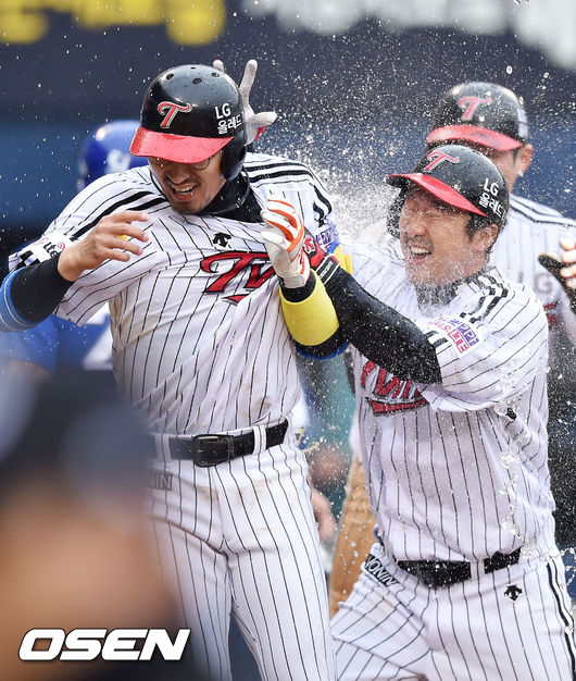9회말 2사 주자 2루 끝내기 안타를 날린 LG 정성훈이 끝내기 물세례를 받고 있다. / rumi@osen.co.kr
